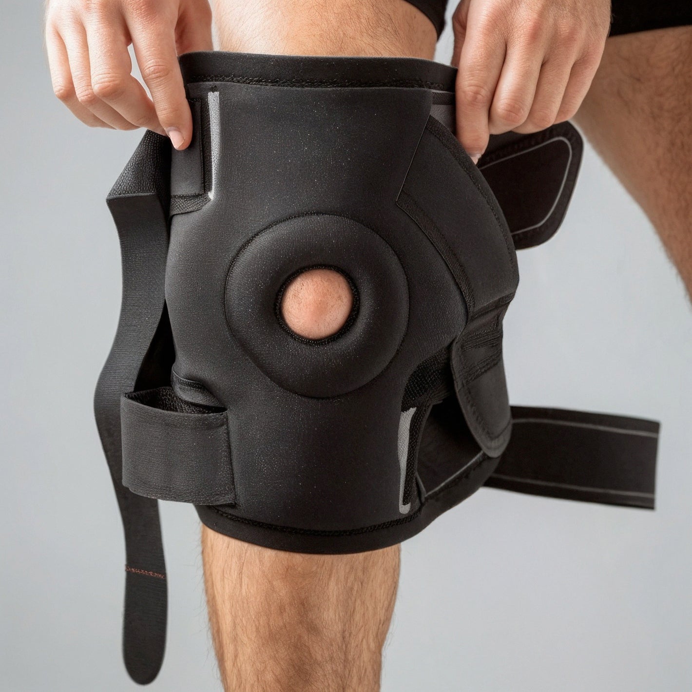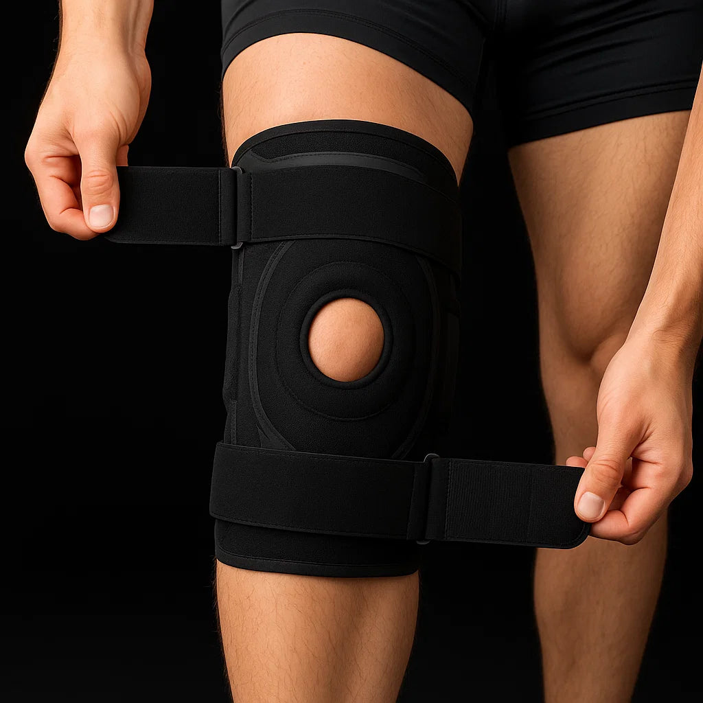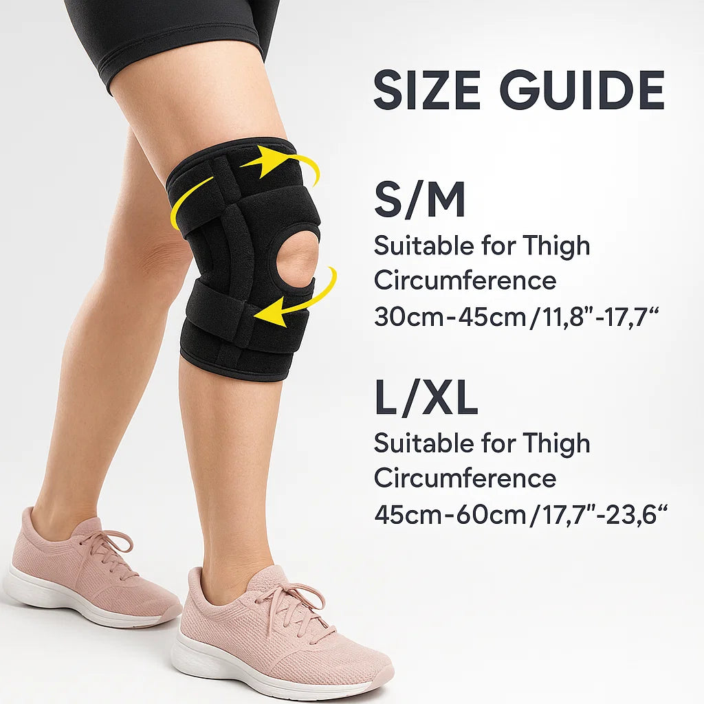 Measure your thigh circumference 4 inches above your kneecap to determine your size. S/M fits thighs 30-45cm (11.8"-17.7") and L/XL fits 45-60cm (17.7"-23.6"). The open patella design (circular cutout over kneecap) accommodates different knee shapes while the adjustable straps let you fine-tune the fit regardless of exact measurements. When in doubt, size up for comfort.